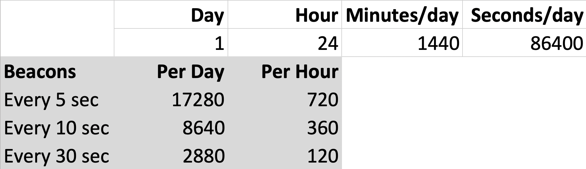 Here we’re looking at a day broken down by an hour (24), by minutes (1440) and seconds (86400) with “standard” beacon intervals of 5, 10 and 30 seconds. For example, if there is beaconing every 5 seconds you should expect to see about 17280 per day or 720 hits per hour... and so on.