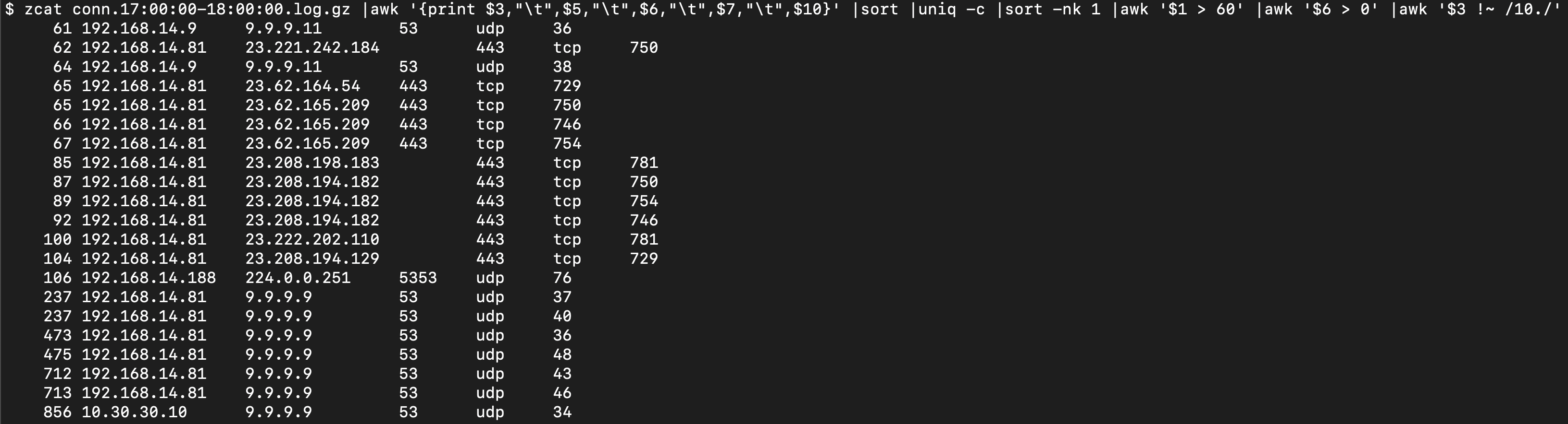 $ zcat conn.12\:00\:00-13\:00\:00.log.gz |awk ‘{print $3,”\t”,$5,”\t”,$6,”\t”,$7,”\t”,$10}’ |sort |uniq -c |sort -nk 1 |awk ‘$1 > 60 {print}’ |awk ‘$6 > 0 {print}’ |awk ‘$3 !~ /^10./ {print}’