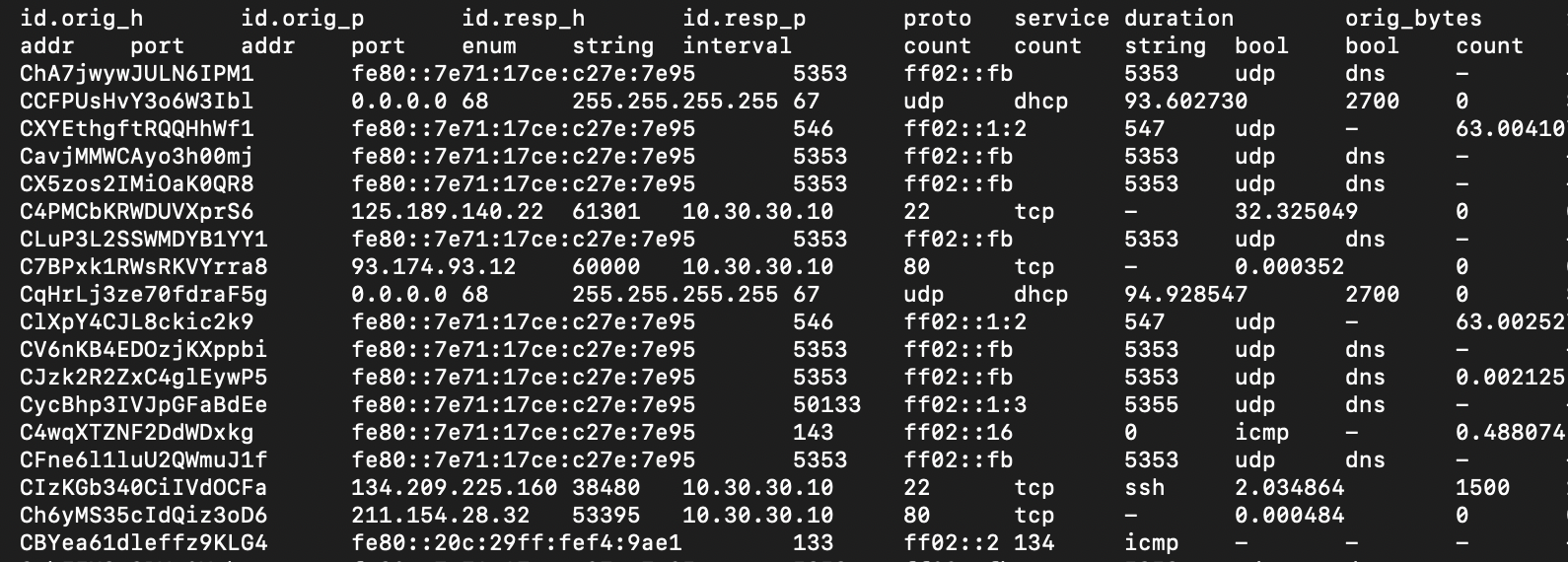 Zeek, formerly known as 'Bro', has a multitude of log files. The one we’re going to focus on in this example is the conn.log (I clipped off the tail end of the last few fields but here is a basic example of the conn.log).